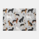 Cute German Shepherds in black and tan, black and red, black and silver, white and back colour coats sit and stand with scattered dog bones and paw prints on a light grey background.