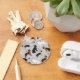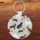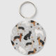 Cute German Shepherds in black and tan, black and red, black and silver, white and back colour coats sit and stand with scattered dog bones and paw prints on a light grey background.