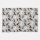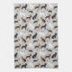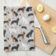 Cute German Shepherds in black and tan, black and red, black and silver, white and back colour coats sit and stand with scattered dog bones and paw prints on a light grey background.