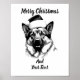 Festive German Shepherd Christmas poster featuring a noble GSD in a Santa hat. Minimalist black and white art. Personalize with your text. Perfect holiday gift for Shepherd owners. Available as a high-quality print or Instant Download for last-minute decor.