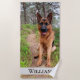 A German Shepherd sitting on a narrow winding path in a pine forest, waiting. A dog with brown and black fur. A light grey frame and a template for your name. Black block letters.