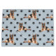An image of a German Shepherd Dog is the feature in the pattern on this all occasion gift bag. The dog wears a blue bow tie amid a pattern of black paw prints, and is repeated on a silver grey background.