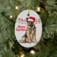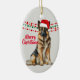 A majestic German Shepherd Dog wears a red and white Santa Claus hat in front of strings of red and green Christmas beads on both sides of this Holiday ornament. On each side is a field for your own custom text.