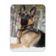 German Shepherd dog posing in the snow wearing a camoflaug coloured bandanna.
