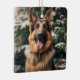 A design featuring a german shepherd in the snow with trees in the background
