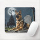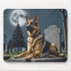 A German Shepherd dog sits vigilantly on a gravestone in a cemetery at night under the glow of a full moon
