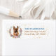 The left side of these return address labels feature an image of a spring flower wreath in colours of soft pink, blue, gold, green and cream. At the centre is a beautiful portrait of a German Shepherd Dog. Tiny gold confetti gives a subtle sparkle to the background. Your custom text is in blue and brown gold at the right.