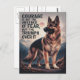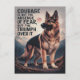 A German Shepherd stands proudly on a mountaintop, with a motivational quote about courage, Courage is not the absence of fear, but the triumph over it, displayed above. The dogs confident pose and the scenic background evoke a sense of strength and determination.