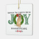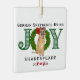 This ornament features a German Shepherd sitting in front of a wreath. The German Shepherd may appear softer in focus to the technique of the illustration. The wreath makes up the letter “O” in joy. Above the German Shepherd, it reads, “German Shepherds Bring.” The complete message on the ornament reads, “German Shepherds Bring Joy.” You personalise the ornament with your dog’s name. Under your dog’s name, there is a candy-striped bone and the year 2024. The candy-striped dog bone appears again on the back of the ornament at the lower portion of the ornament. You can type a sweet note to your fur baby on the back if you desire.