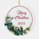 On the front of this Holiday ornament is a beautiful portrait of a liver and white German Shorthair Pointer dog peeking out of a holly and evergreen bough. Red berries and pine cones decorate the holly and pine sprigs. The image is placed on a white circle within a thin red line circle. The back of the ornament has the same evergreen bough wreath and circle with your custom text in red.