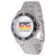 Has heft and feel of expensive stainless steel quartz watches. Good band with safety catch. I removed links, which is easy because engraved arrows show direction to push the linking pins. As always by this seller, the image (a railroad logo) is a perfect reproduction of my emailed image, and is precisely spaced and aligned.