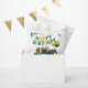 Celebrate in style with this charming watercolor illustration featuring a vibrant yellow and green tractor resting in a grassy field adorned with colourful flowers. A festive green and yellow banner proudly displays “Happy Birthday,” while matching balloons add to the cheerful atmosphere. In the background, a rustic building completes this delightful country-inspired scene, perfect for a farm-themed birthday celebration!