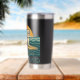 This retro-inspired surf art features a too-cool bulldog who rides an endless wave in front of the setting golden sun. "Get On Board" is written in teal vintage coastal font. Designed with old-school California energy, the distressed look gives it an authentic feel, like it was pulled straight from a vintage surf shop. This insulated tumbler is perfect for beach days, surf sessions and as an everyday statement accessory. Stay salty, and hydrated.