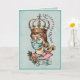 This colourful Get Well Card features a watercolor painting of a woman wearing a crown and a mask on a sea foam green distressed background. On the inside left there is an all over background pattern with coordinating corona virus images. On the right side the text says "Hope you feel better real soon..."