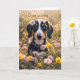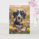 A get-well card featuring a caring, sweet pup nestled in a bunch of pink and yellow flowers, expressing sympathy for not feeling well.