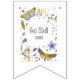 This bunting banner displays a collection of nature themed decals butterflies and flowers in a blue/gold style plus letters showcasing the phrase "Get Well Soon" with a typograph style in this Get Well Soon theme. All banners have single sided printing outdoor safe and made with thick plastic rope has (16) 5.5" x 8" swallowtail flags on a 6' long string.