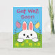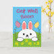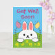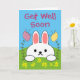 Cute white cartoon bunny rabbit with big pink ears and an adorable face is poking out of his rabbit hole in the green grass. He is surrounded by lots of pretty flowers on a clear spring day. Above the bunny in pink lettering is the message Get Well Soon. This is a template and can be used as it is or replaced with your own message. Inside the card also in pink text is a template to replace with your own message or simply delete the text to leave blank. On the inside and on the back of the card is a picture of the same cute bunny face.