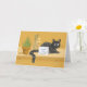 Brighten the day of someone who you are sending get well greetings to. This funny card shows a cat sitting on a wooden table with a snake plant and vases of wild flowers. A card is open on the table that says your message - Get well soon!