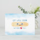 This cute design is a great way to remind your loved one you care when they are under the weather. Featuring watercolor bandage with eyes and smile, the featured message is "GET WELL SOON! (We kinda HEART you.)" Heart illustration implies word, "love" in message and background is soft blue watercolor. Inside can be customised with your own message.