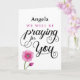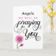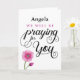 Encourage someone recovering from an illness or injury by letting them know you are praying for them by name with this custom front calligraphy typography design featuring the message, "CUSTOM NAME HERE we will be praying for you." Design is accented by beautiful pink watercolor flower in lower left corner of card. Inside can be customised with your own message.