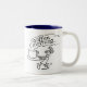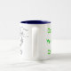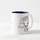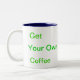 custom-made coffee mug with blue trim. Words say "Get your own coffee" on 1 side of mug.
