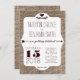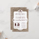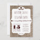 Getting Hitched Burlap Print Wedding Invitations with a modern typography style lettering design with a small heart at the top and an arrow surrounding the "getting hitched" text. The burlap is just a printed design, not actual burlap fabric. It is also on the back. These are great for country weddings, barn weddings, and anyone looking for a rustic themed wedding announcement.