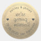 Chic and simple save the date label, with your names and wedding date in off-black modern typography on a champagne gold background, and the text 'we're getting married' in stylish script font. Use these wedding stickers for your wedding gifts, gift bags or as a save the date envelope seal. Exclusively designed for you by Happy Dolphin Studio. If you need any help or matching products, please contact us at happydolphinstudio@outlook.com.