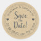 Chic and simple save the date label, with your names and wedding date in off-black modern typography on a kraft paper background, and the text 'save the date' in stylish script calligraphy font. Use these wedding stickers for your wedding gifts, gift bags or as a save the date envelope seal. Exclusively designed for you by Happy Dolphin Studio. If you need any help or matching products, please contact us at happydolphinstudio@outlook.com.
