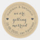 Chic and simple save the date label, with your names and wedding date in off-black modern typography on a kraft paper background, and the text 'we're getting married' in stylish script calligraphy font. Use these wedding stickers for your wedding gifts, gift bags or as a save the date envelope seal. Exclusively designed for you by Happy Dolphin Studio. If you need any help or matching products, please contact us at happydolphinstudio@outlook.com.