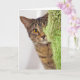 Tabby cat peeking around shredded green scratching post for getting old birthday humour.
