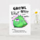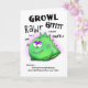 A very grouchy dino monster who is not impressed with getting another year older... but there is a funny bright side! He's not as old as he will be next year! Dino is a hand drawn cartoon. Green dino has a slight pink highlight behind him. Card has a white backgroud with black lettering.
