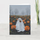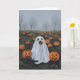 This greeting card features a watercolor portrait of a dog dressed as a ghost standing in a spooky pumpkin patch.