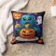 A playful ghost relishes pumpkin guts while surrounded by carved jack-o'-lanterns and spooky decorations, celebrating the festive spirit of Halloween.