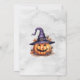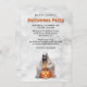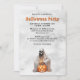 Halloween party invitation featuring watercolor illustrations of a skeleton ghost and jack o’lanterns.