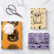 Wrapping paper features 3 different Halloween-inspired designs with customisable background colours: a jack-o-lantern trick-or-treat pail with candies, a cute ghost surrounded by stars with a moon, and a friendly ghost with bats and a pumpkin!