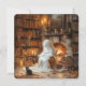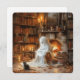 A quiet ghost lounges in an ornate armchair, surrounded by flickering candles, scattered autumn leaves, and towering stacks of books. The warm glow of a crackling fireplace casts soft shadows across the room, while a black cat keeps silent watch nearby. With shelves brimming with forgotten tomes and a misty tree portrait overhead, the scene blends spectral solitude with scholarly charm—perfect for those who find comfort in the eerie and delight in the quiet magic of Halloween.