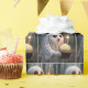 A ghostly figure stands in a misty forest, holding a cupcake adorned with a single lit birthday candle