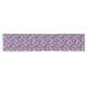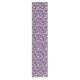 Seasonal Halloween table runner adorned with ghosts, pumpkins, bats, and skulls on a purple background.