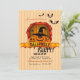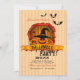 A ghoulish orange stripe Halloween party invitation design with black bats, scary pumpkins and a banner with the words "Halloween Party". The card is easy to customise with your wording, font, font colour, paper shape options and choice of six paper types.