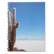 Notebook with a giant cactus on the white salt flats of the Salar de Uyuni in Bolivia.