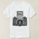 A t-shirt with a giant high contrast, high passed filtered and vectorised image of a vintage East German camera from the 1950s. Creating a strong bold toothy retro screen print. or mediaeval Gothic brass rubbing like effect.