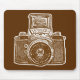 A Mouse pad with a high contrast, high passed filtered and vectorised image of a vintage East German camera from the 1950s. Creating a strong bold toothy retro screen print. or mediaeval Gothic brass rubbing like effect.