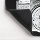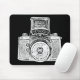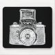 A Mouse pad with a high contrast, high passed filtered and vectorised image of a vintage East German camera from the 1950s. Creating a strong bold toothy retro screen print. or mediaeval Gothic brass rubbing like effect.