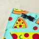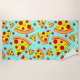 Trendy beach towel printed with giant pepperoni pizza pie slices on a light blue background. Funky towel for pizza lovers!