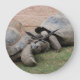 This is a photo of Galapagos tortoises. These adorable, huge reptiles are hanging out, relaxing, and eating grass in a zoo.