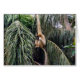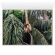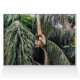 Featured hanging from a tree with her arm is a white female Gibbon monkey.