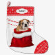 The front of this Holiday stocking shows an image of an adorable brown and white Bulldog puppy peeking out of a red and white Santa style gift bag. Behind the dog is a red beaded garland. The toe and top border are a red and white snowflake pattern. On the top border is a white label with your custom text in dark grey. The back of the stocking is the same red and white snowflake pattern.