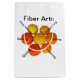 Yarn balls in centre with text labels for various fibre arts: crochetting, embroidery, sewing, knitting, quilting, and weaving. Balls of yarn in shades of oranges and yellows.