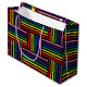 Rainbow coloured stripes form a band that is set in a woven pattern. Coloured stripes are set between black stripes. Colours are red, orange, yellow green, blue, purple, and pink.