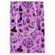 Gift Bags with a modern minimalist design for Halloween, a pattern of silhouettes of a broom, owl, spider web, cat silhouette, witch on a pink background.